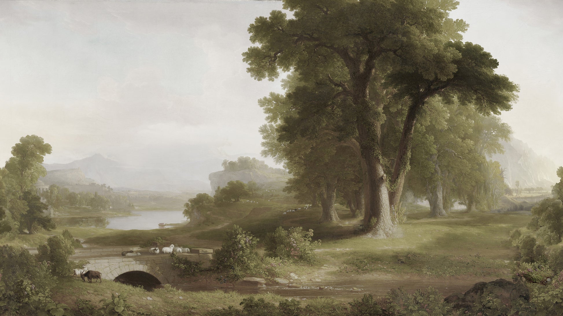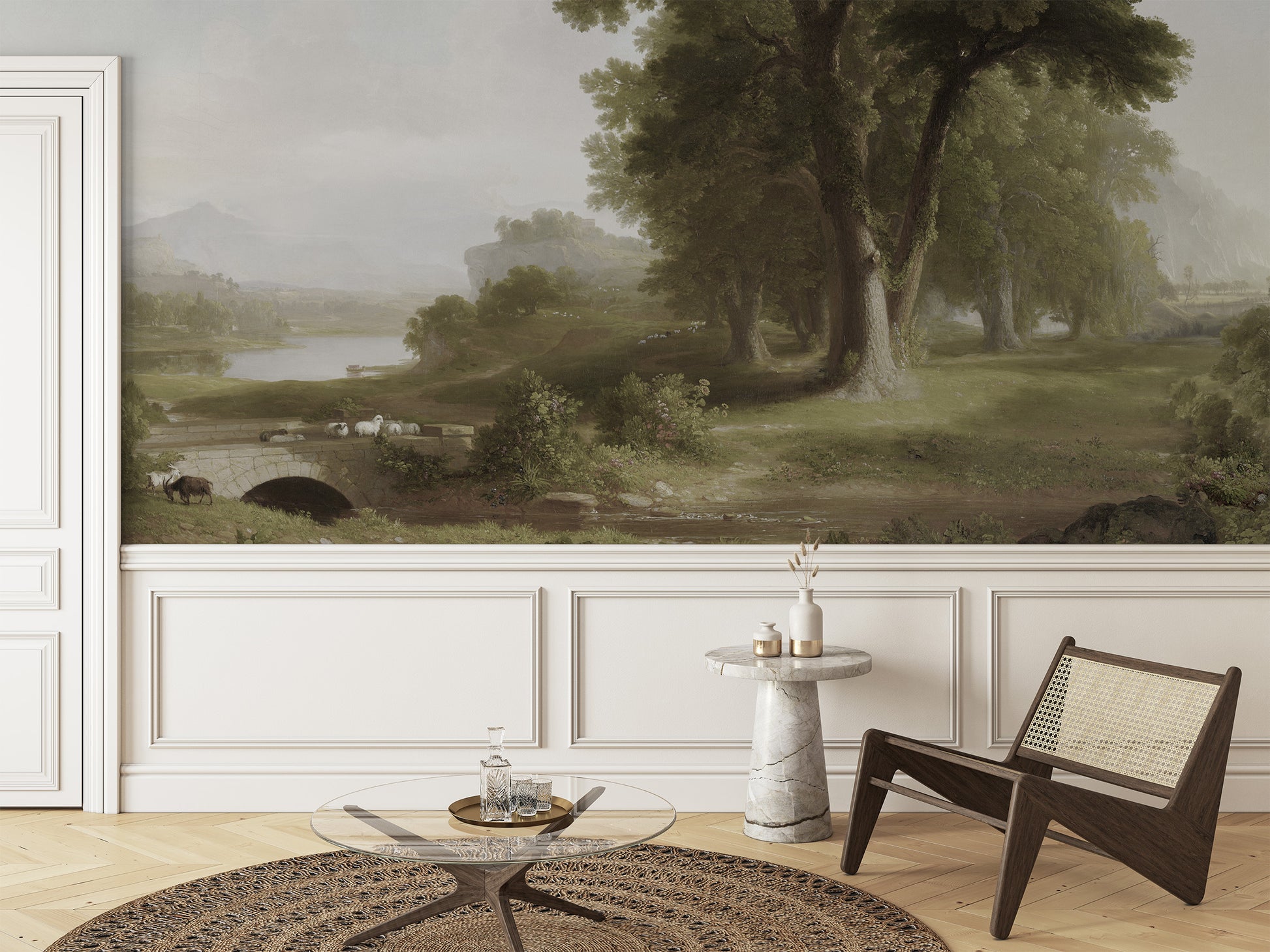 The texture of the oil painting is evident, with visible brushstrokes cracks from ageing adding richness and a tactile quality to the scene. Light and shadow play harmoniously across the landscape, evoking a sense of nostalgia and the grandeur of classical landscape art. The overall effect is both dramatic and serene, making this mural a timeless and captivating feature.