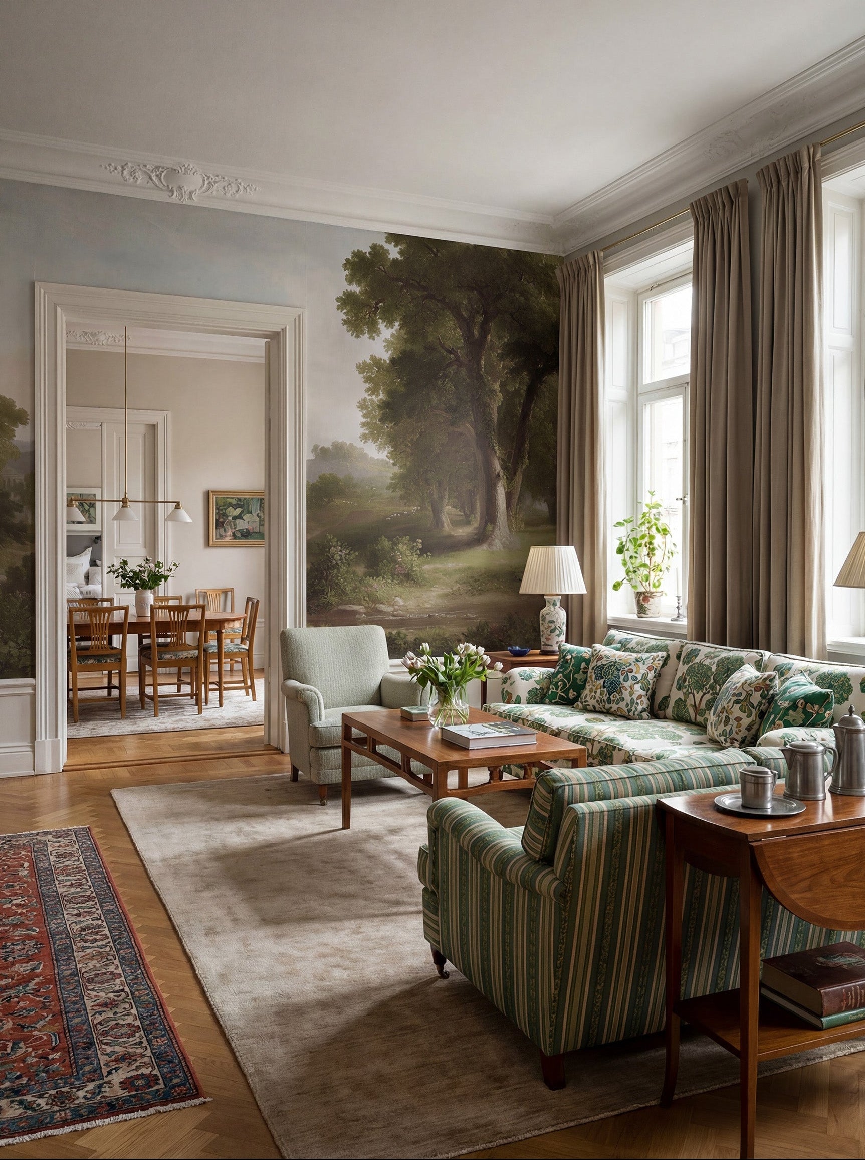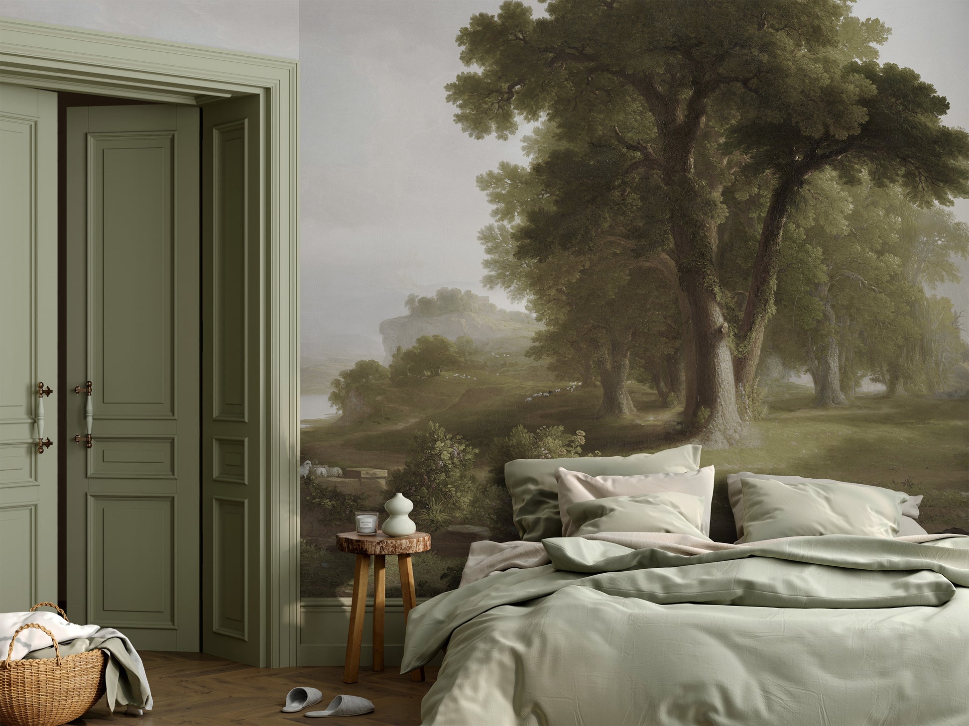 Based on an oil painting, this mural features a timeless landscape with a small, meandering river in the foreground. A group of tall, majestic oak trees stands at the heart of the composition, their branches and lush foliage forming a striking contrast against the open valley beyond. The rolling hills in the background fade into a hazy, atmospheric perspective, painted in muted earth tones, with warm ochres, deep greens, and soft browns blending together seamlessly.