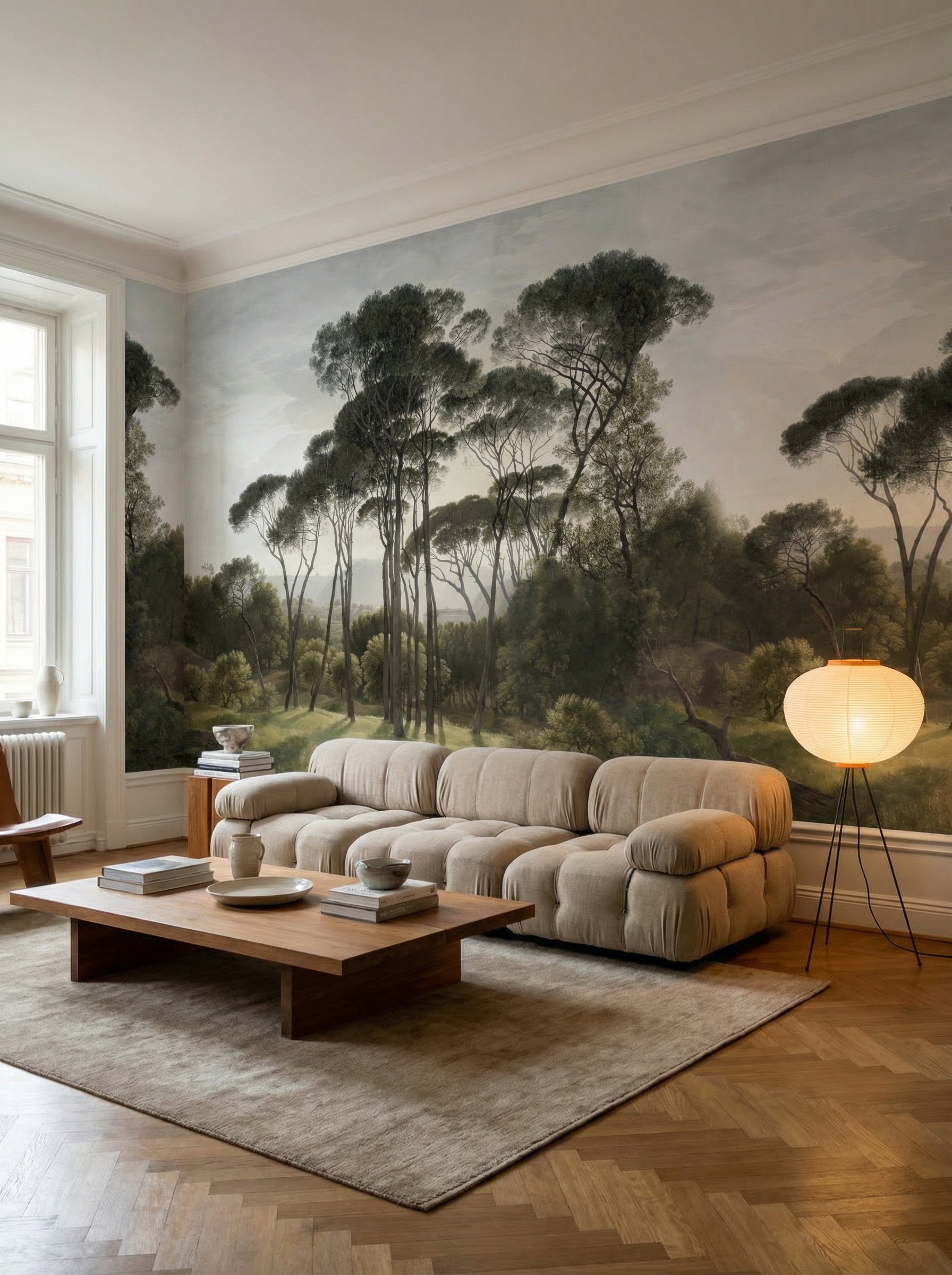 This stunning wall mural showcases an Italian landscape in the style of a classic oil painting, featuring elegant pines standing tall against rolling hills and a sunlit horizon. Rich, textured brushstrokes bring depth and warmth, while earthy tones and golden light evoke the timeless beauty of the Mediterranean countryside. Perfect for adding an old-world charm and sophistication to any space.