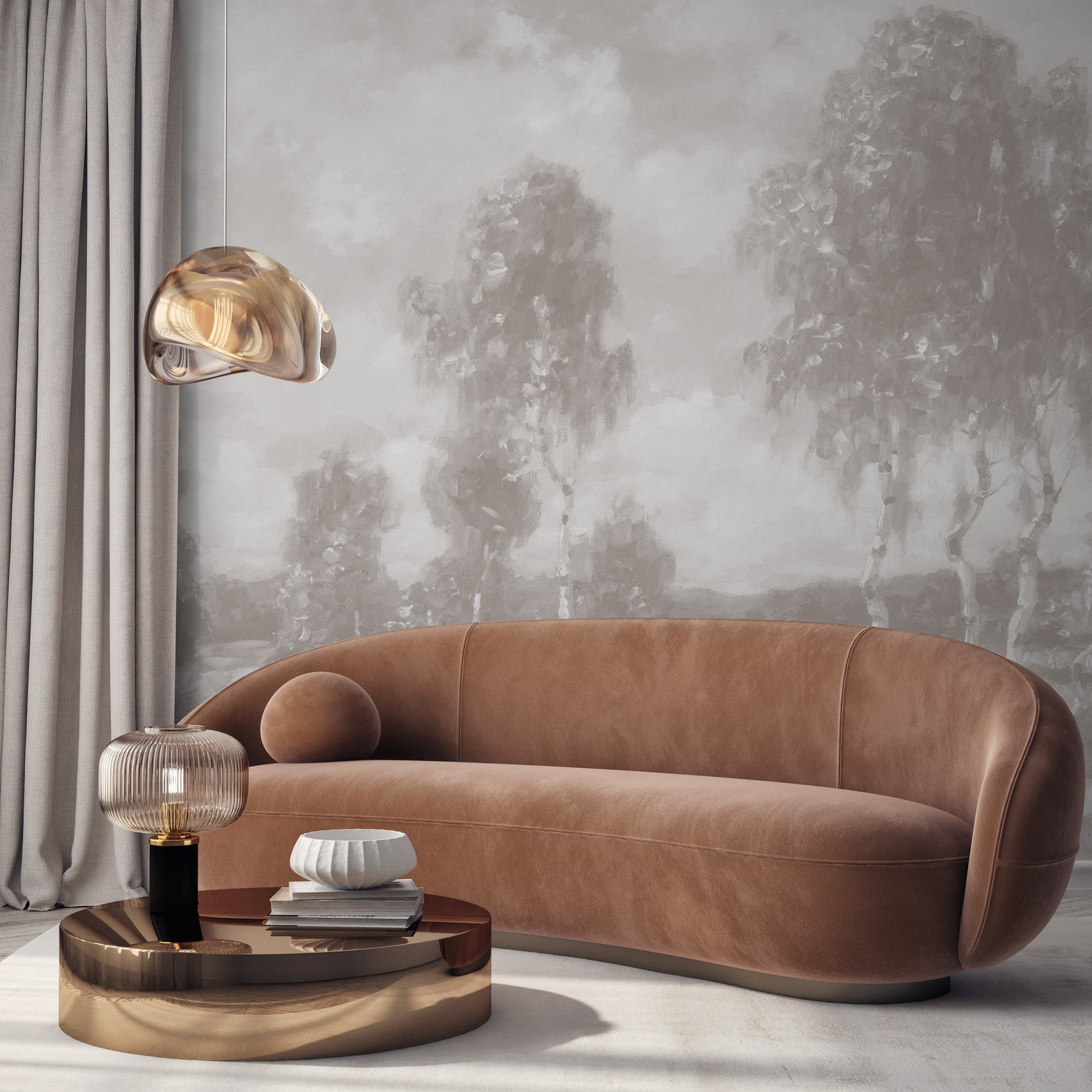 See the beauty of the countryside with Landscape I wallpaper mural. Featuring a calming beige colorway, this landscape painting captures the serenity and simplicity of nature. Transform any room into a peaceful haven with this timeless piece, perfect for any art lover.