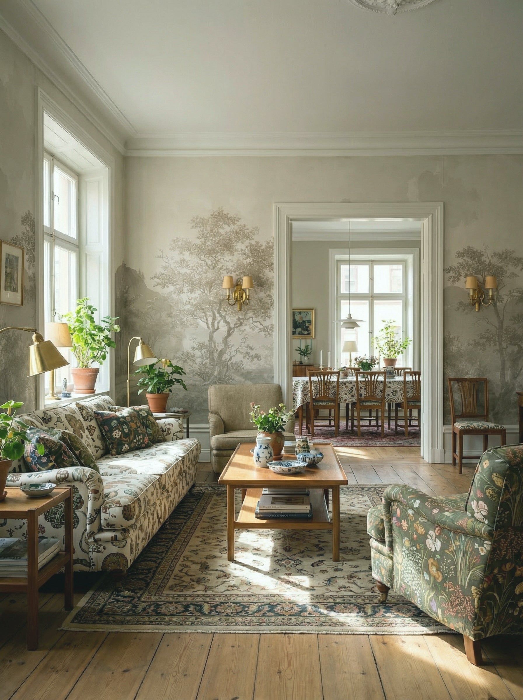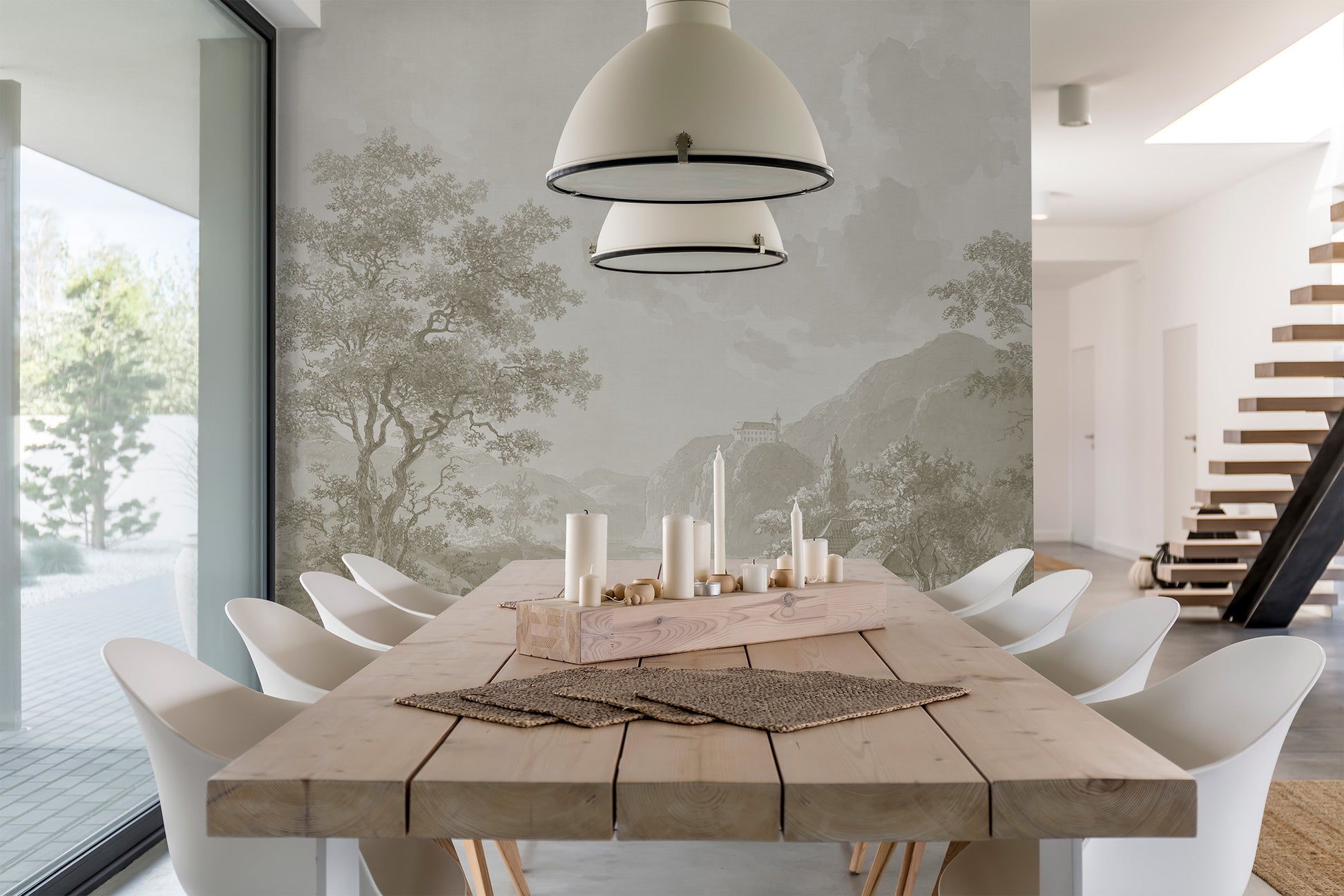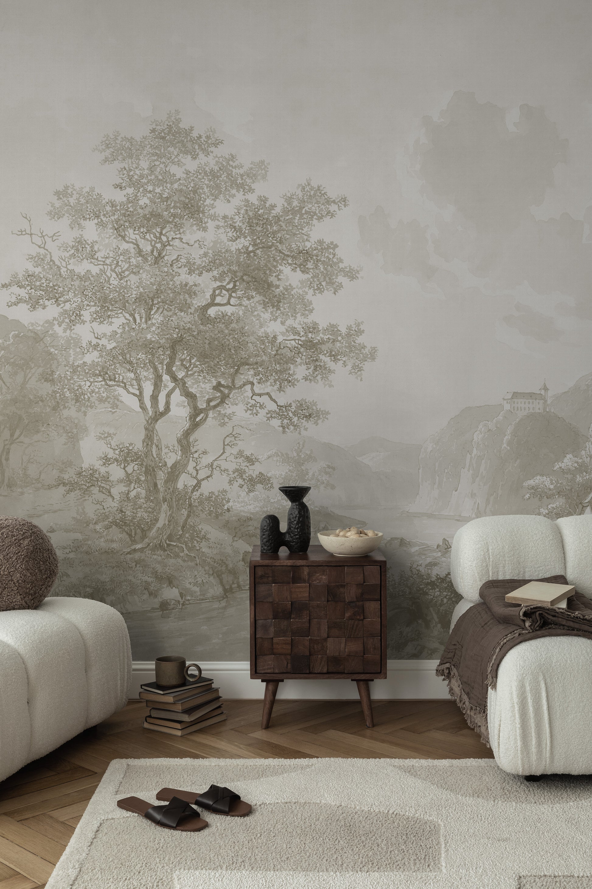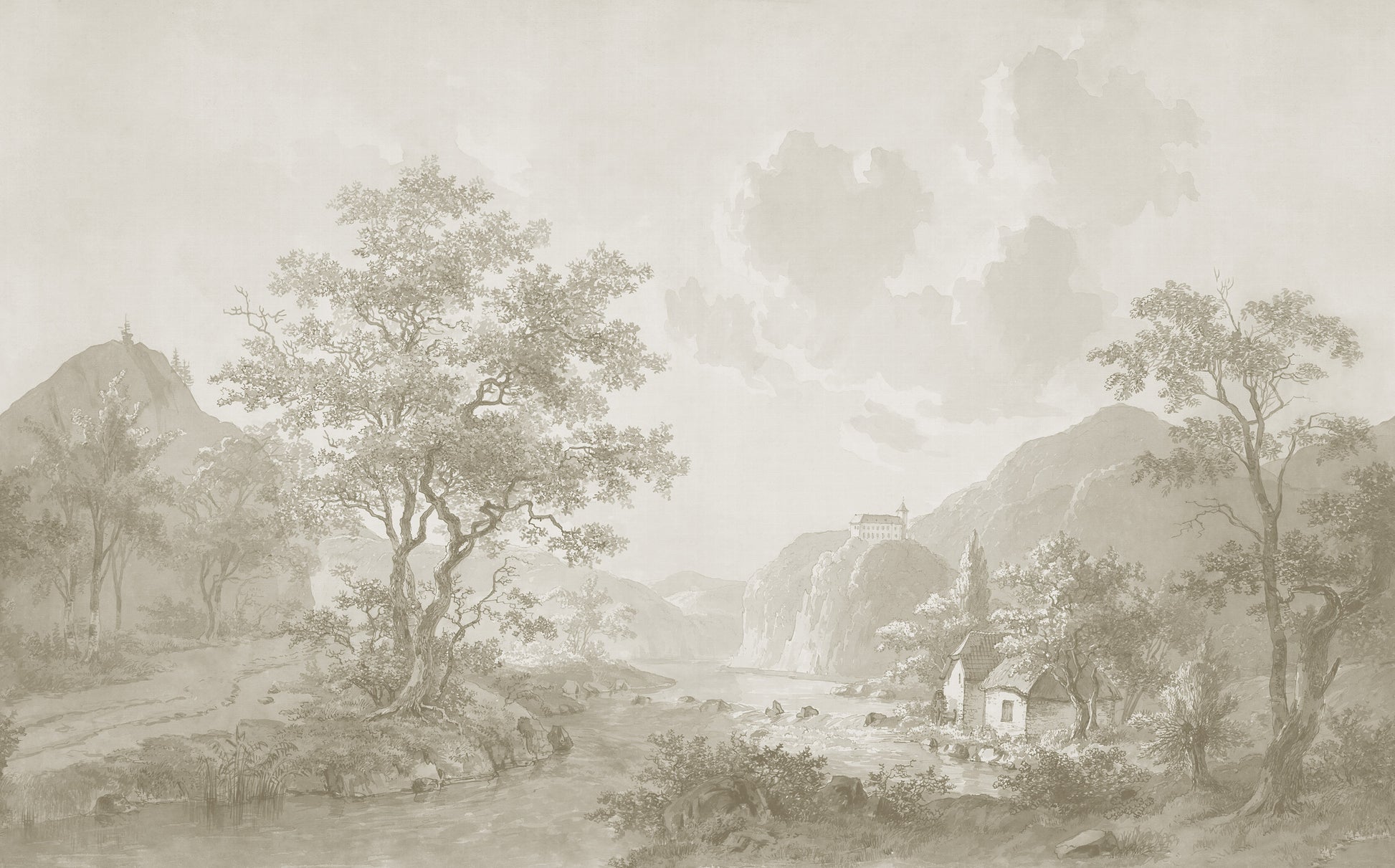 This mural features a countryside scene painted in soft, flowing watercolor strokes, with a harmonious beige-toned palette. The composition includes gently rolling hills with a castle fading into the distance, a winding river, and a charming old mill nestled along the water’s edge. The trees, depicted in loose, airy brushstrokes, sway subtly, adding depth and movement to the scene. The beige color scheme ranges from warm sandy tones to soft taupe and ivory highlights, creating a dreamy, timeless aesthetic.