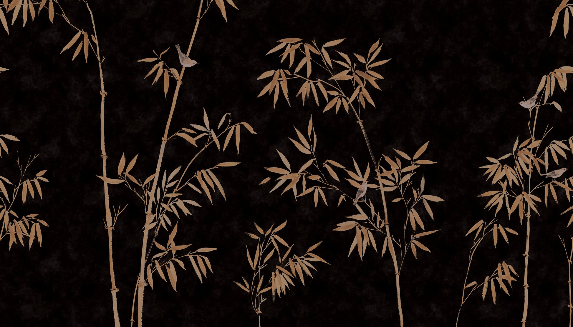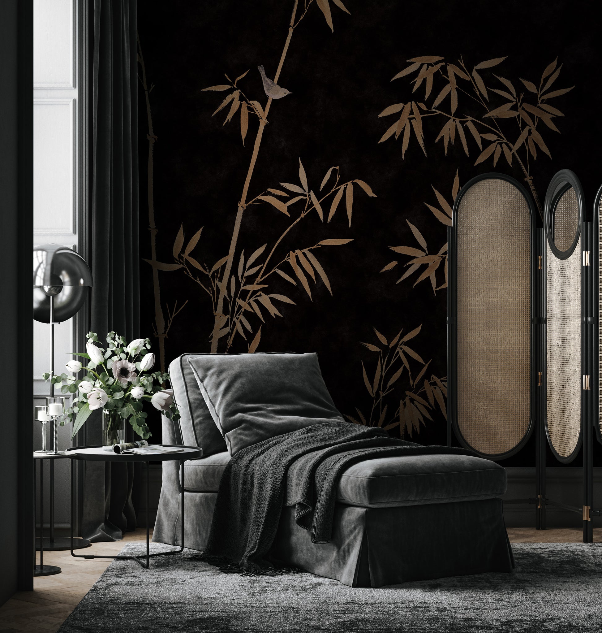 Bring a natural touch to your walls with Yokohama Black wallpaper mural. Enjoy the Japanese beauty of bamboo trees and stunning birds on a striking dark backdrop - the perfect addition to your home's bohemian aesthetic.
